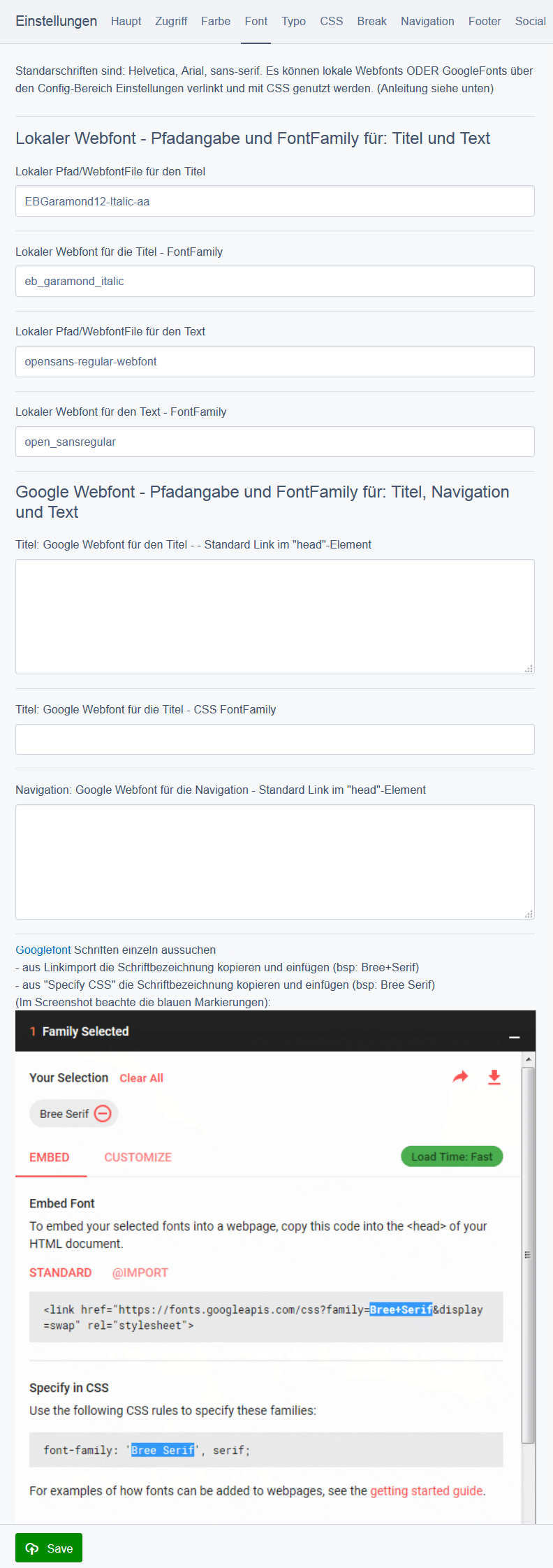 Wahlweise können Schriften aus GoogleFont oder lokal eingebunden werden. Für Text, Navigation oder Titel.