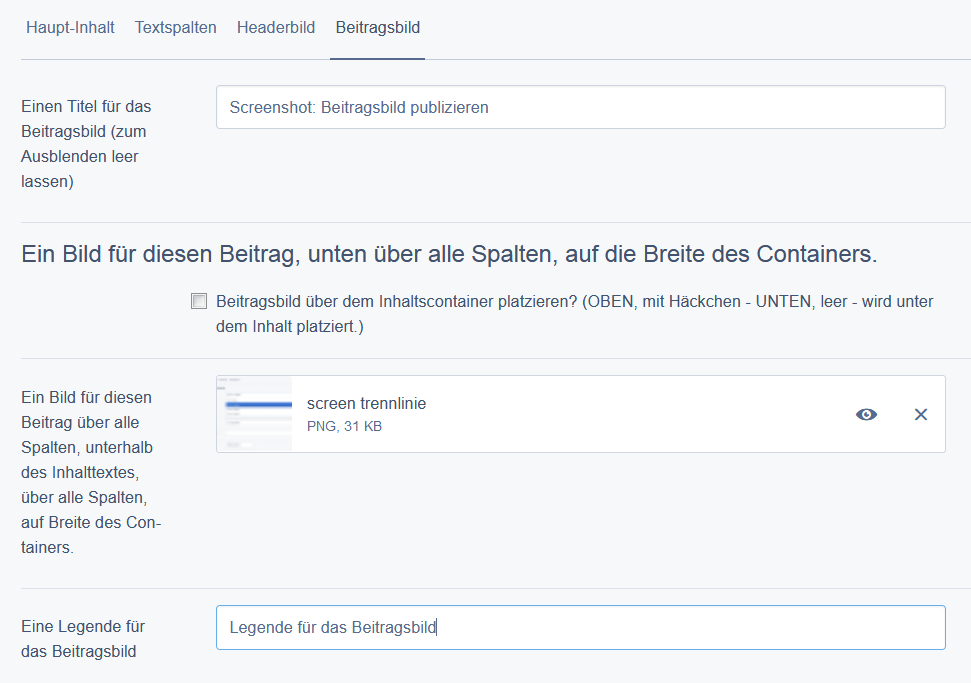 Für jeden Beitrag kann ein Bild (Aufhänger) hochgeladen werden. Das Bild richtet sich nach der Breite des Inhalt-Containers. Optional kann ein Titel darüber eingegeben werden. Es kann mit einer Legende unterstützt werden. Es kann über, oder unterhalb des Inhalts platziert werden.