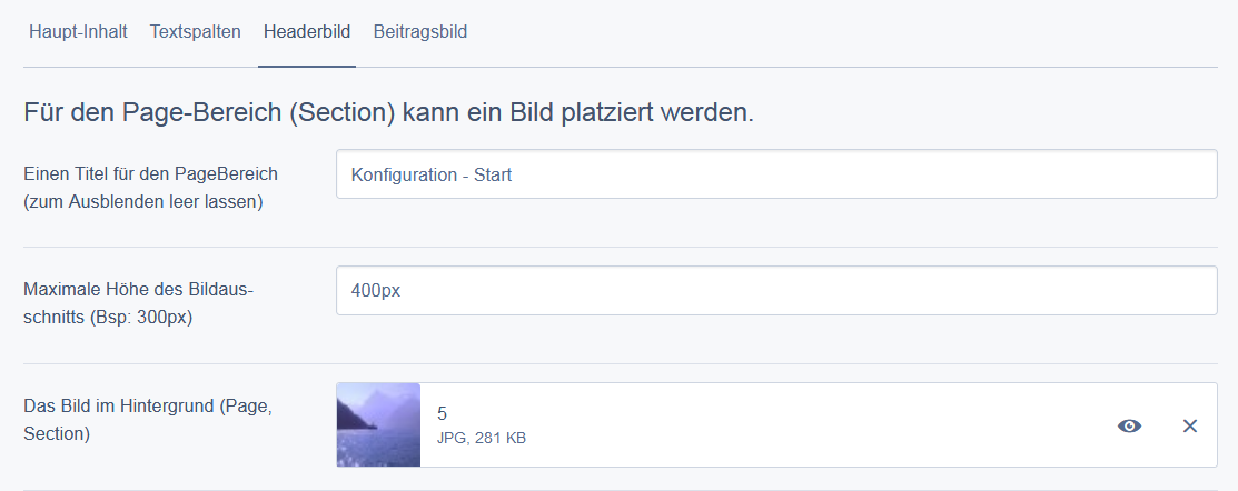 Das Headerbild wird zwischen der Top-Navigation und dem Inhalt im Section-Container platziert. Folgende Möglichkeiten stehen bereit: