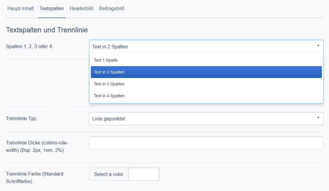 Die Anzahl der Spalten und die Art der Trennlinie kann eingegeben werden.